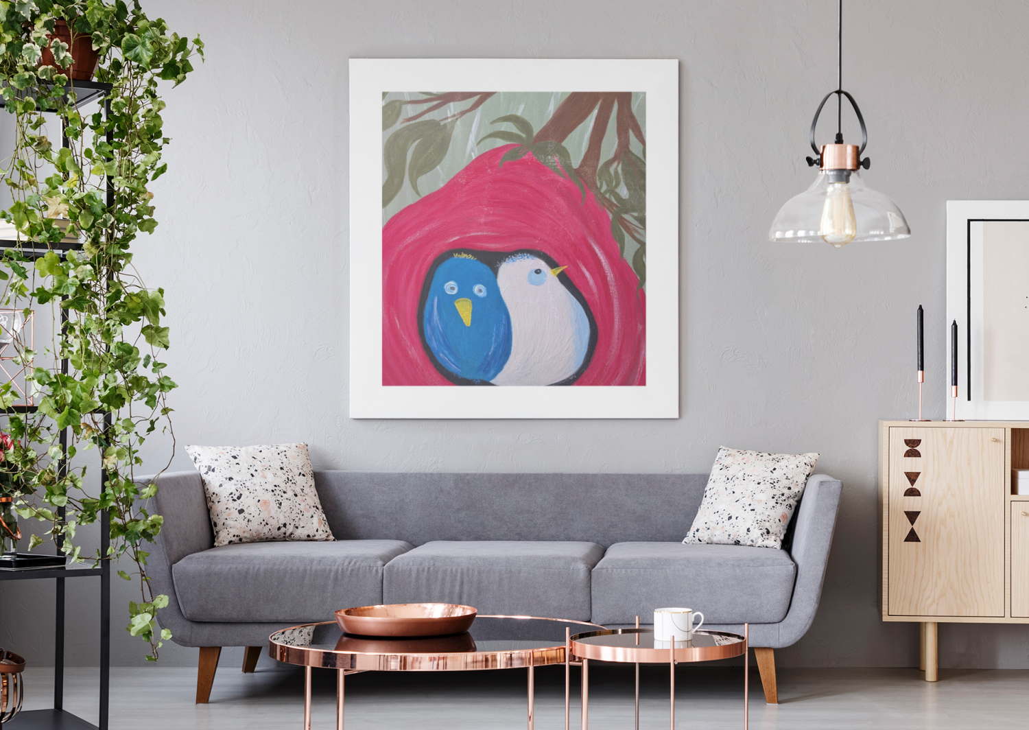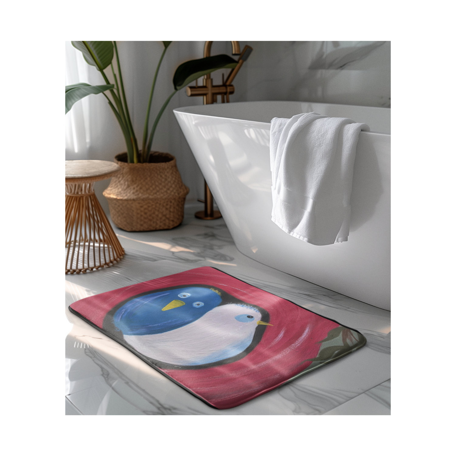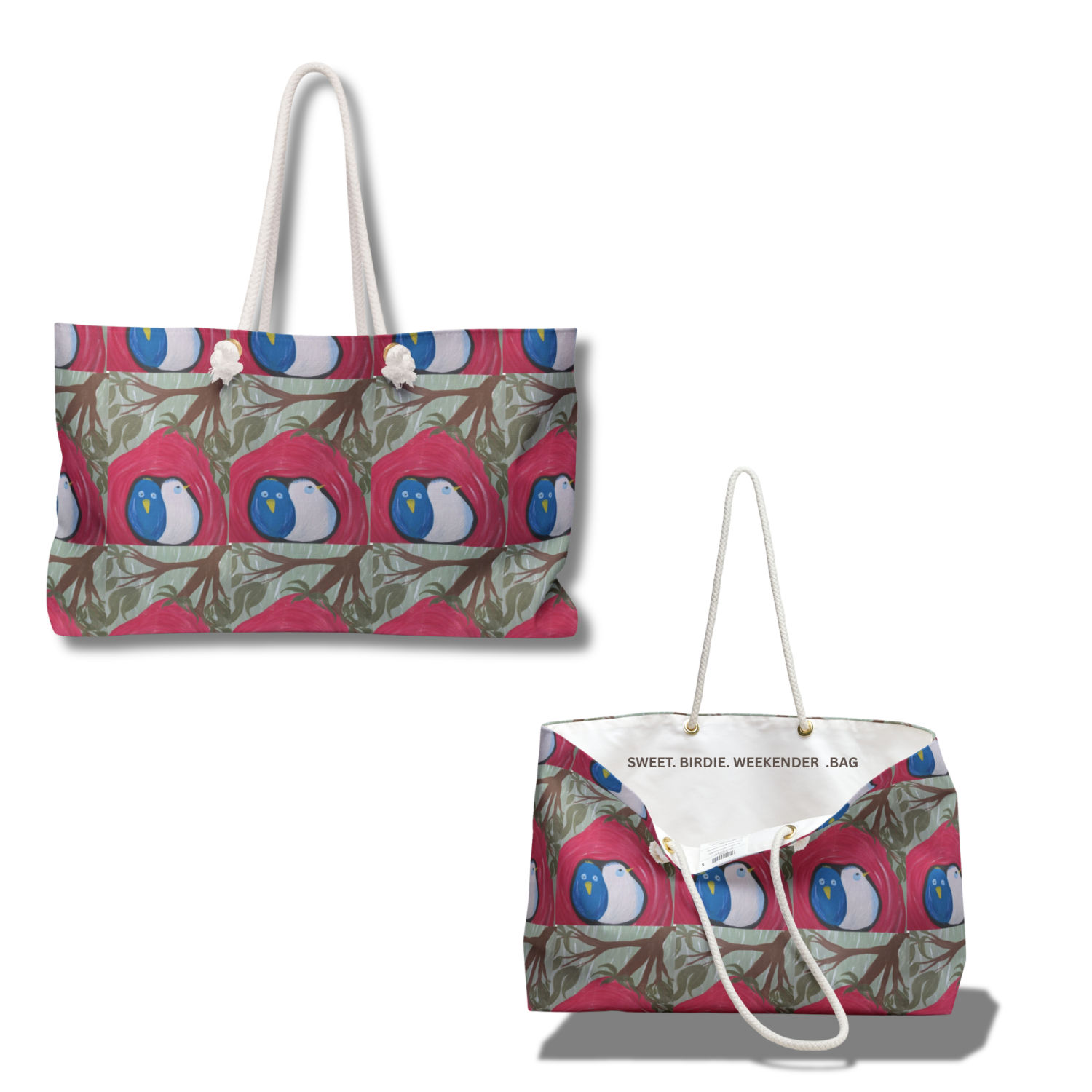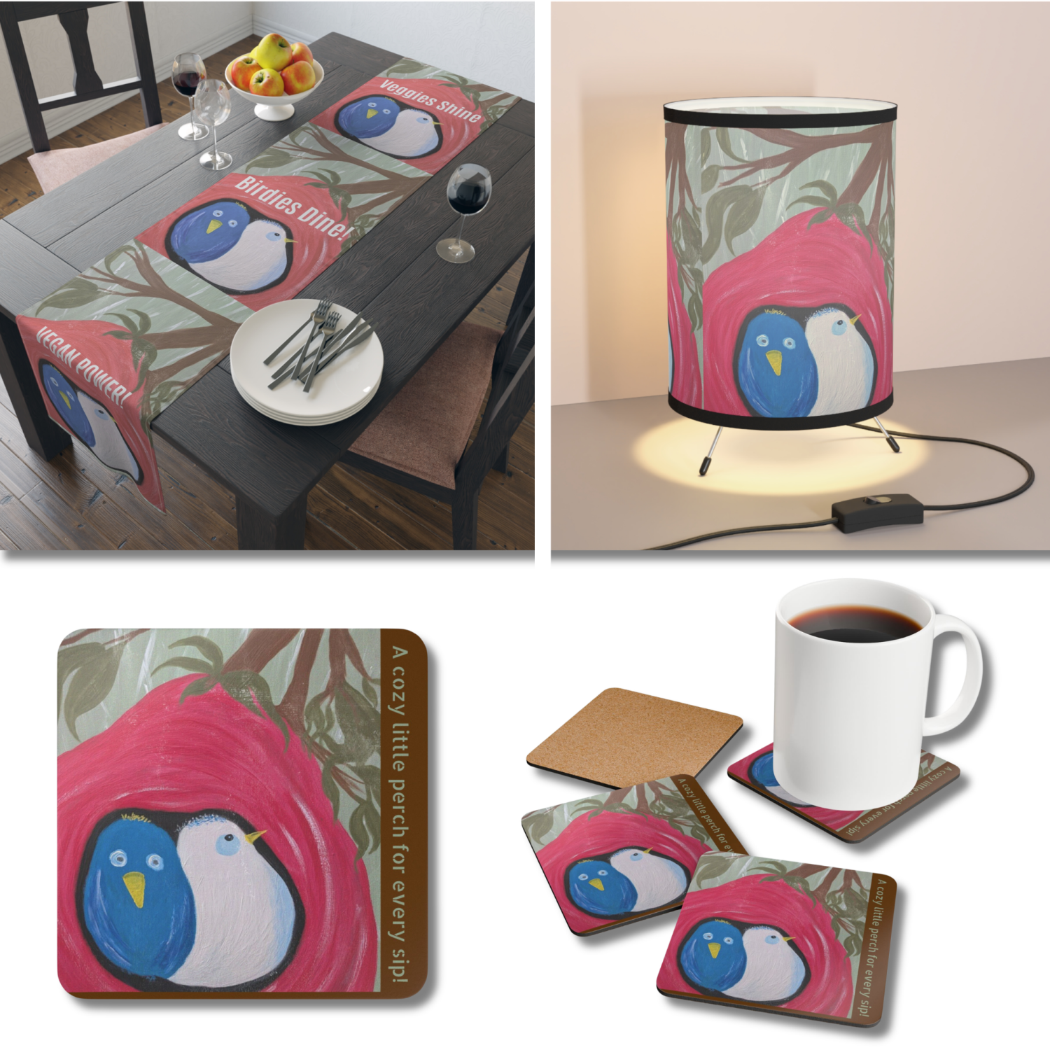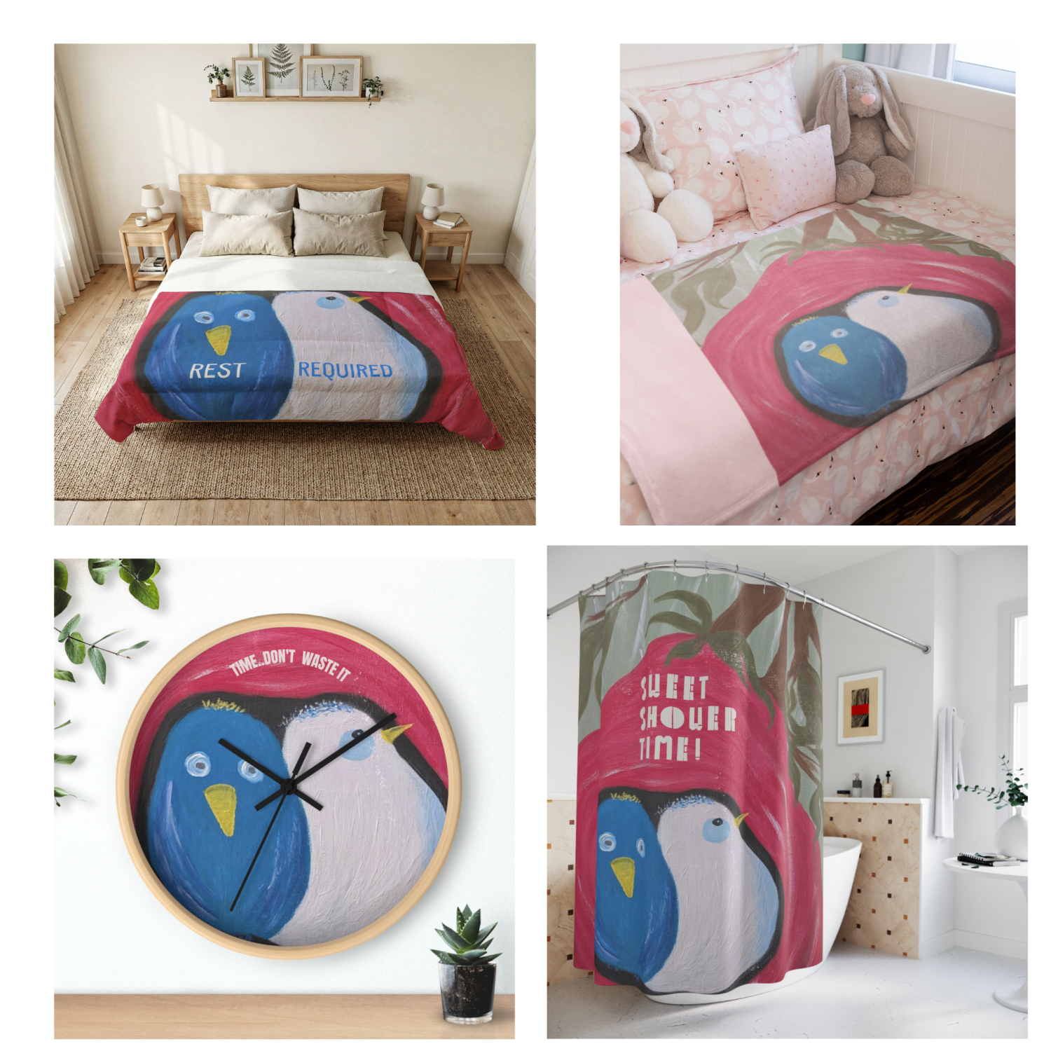 Bath Mat, Wall Art, Weekender Bag, Adult Bed Comforter, Toddler Throw Blanket, Wall Clock, Shower Curtain, Table Runner, Night Lamp, Table Coasters....Sweet Birdies are adaptable!